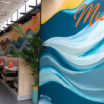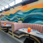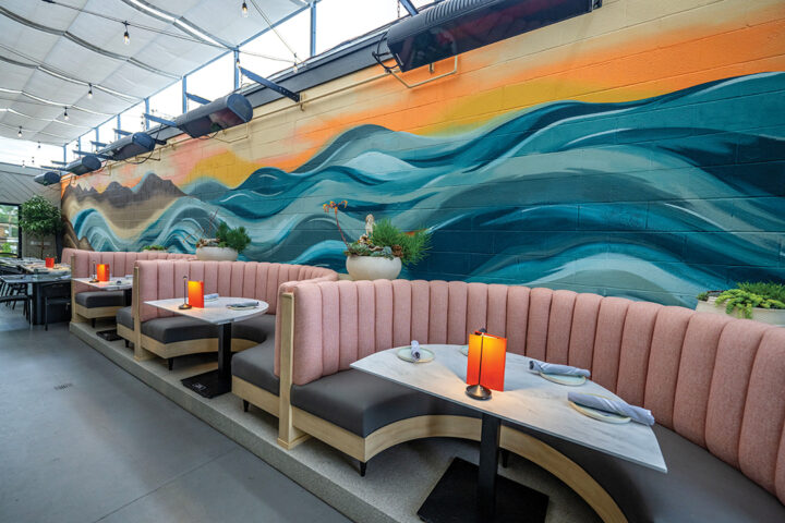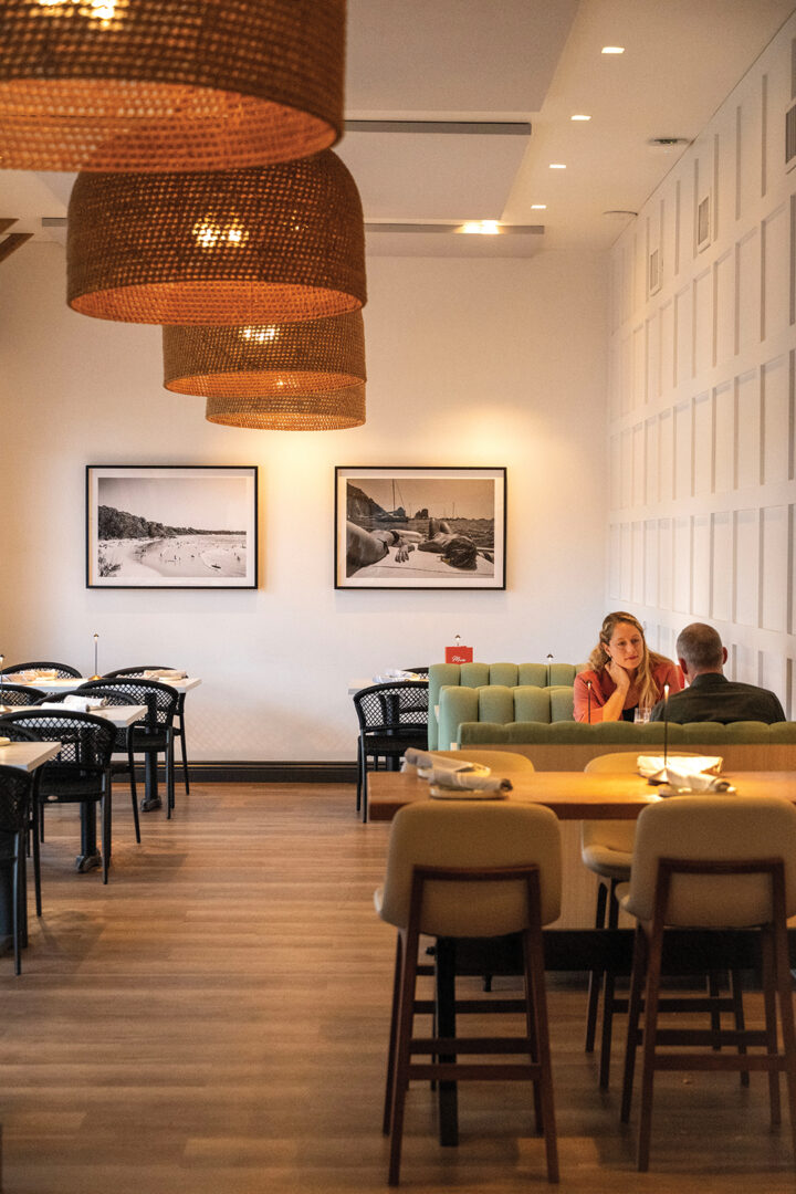While Mia’s’ edible (and rather affordable) fare brings in widespread regional influences, its interiors take precise inspiration from Baja and the sea. Torrey Pines High grad Adam Arnold of TLK Builders oversaw the interior’s transformation into a warm space with sage-upholstered seating, medium-toned wood accents, and white walls replete with coastal-inspired artwork. The beachy vibes extend into an alley lined with coral banquettes care of a wall-length mural of a wave in motion beneath a citrus-hued sunset from local artist Carolina Arrieta. It’s exacting yet in no way overdone.