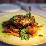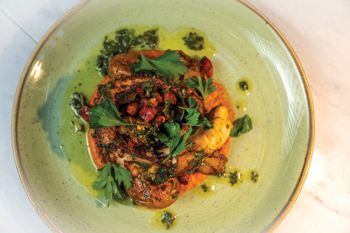 On the entrée side, bone-in Mary’s Chicken is enlivened with Aleppo pepper and served with pistachio dukkah (an Egyptian spice blend), while an ancho rub and chimichurri add depth of flavor to char-broiled skirt steak. Lamb chops taste as if they’ve been extracted from a tagine thanks to minted jus, tender confited eggplant, and couscous studded with tangy dried fruits. But if there’s a must-order dish, it’s the chile relleno, a blackened poblano stuffed with a delectable, oozy blend of Mexican cheeses and topped with mango and shrimp. It’s both heartwarming and stomach-filling.