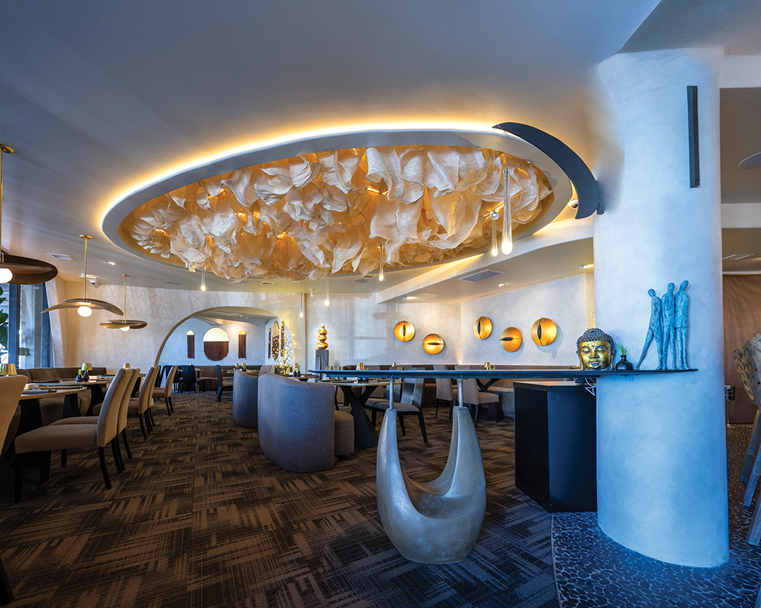 Years elapsed — a full decade — but his clientele’s inquiries about when he would reopen Roppongi remained plentiful. It was enough to inspire a full-scale revival, with Ladeki reinstalling his concept in the very same space where it was born. In doing so he aimed to update its aesthetic, partnering with interior designer Stephanie Parisi to bring in handcrafted oval tables, a leathered quartzite bar, eye-catching ceiling sculptures, nature-rooted wall art, and a pair of worldly fireplace-anchoring Buddhas. The reimagined Roppongi is softer — zen even — with an aura akin to an art museum.