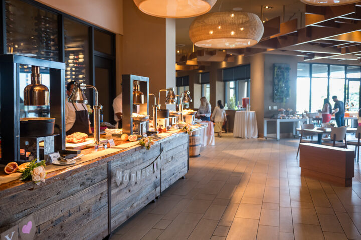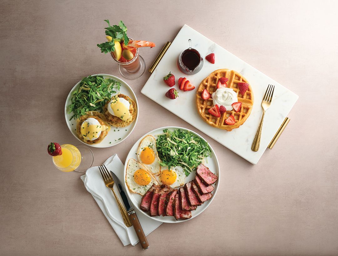 Vue offers a coastal-inspired brunch buffet featuring chef-driven selections and seasonal favorites, complemented by sparkling bubbly and views of the resort’s rolling fairways. Guests can enhance the experience with a curated bouquet, adding a thoughtful finishing touch to the celebration.