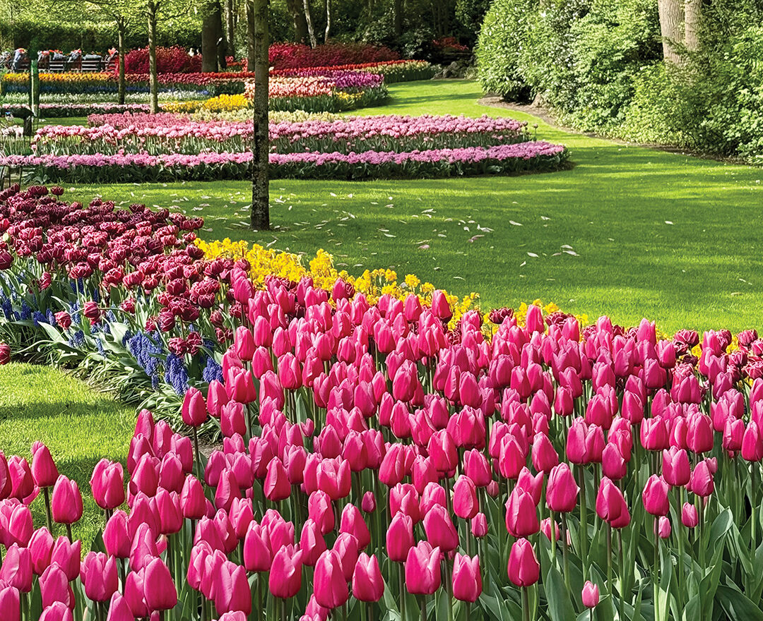 Nearby at Keukenhof Gardens, we got up close and personal with more than 4,000 blooming tulips in all their resplendent glory. Every color of the rainbow waved lazily in the warm sun as we strolled by, planted by a team of some 40 tenders who keep this 80-acre park setting fresh for its visiting hoards. Triumph tulips are the sturdy flowers we most often see in our home arrangements, but here they are commoners. Of the more than 7 million bulbs planted here each year in landscaped groupings, standout varieties included the startling beauty of fringed-top pink ladies, the variegated petals of tulips in many colors, flamed and feathered varieties of Rembrandt tulips, ruffled and flamboyantly orange Parrot tulips, and so many more.