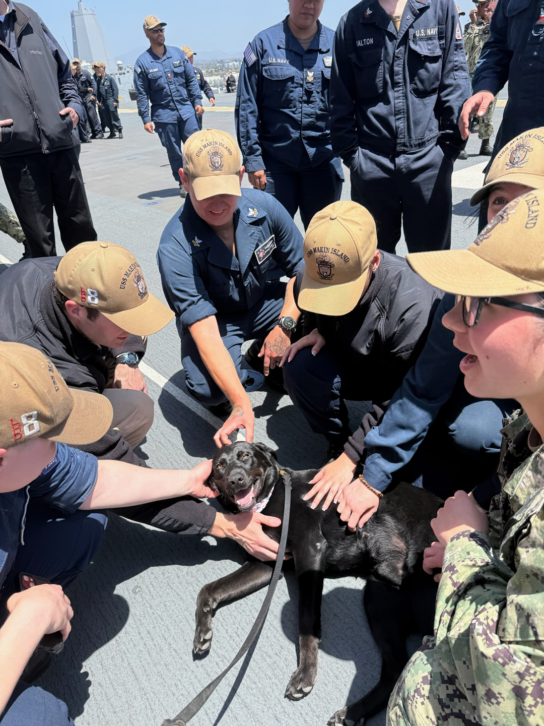 Service dogs cannot be touched or pet by anyone other than their handler. The Canine Ambassadors, on the other hand, are specifically trained to bring joy by providing love and affection to all they meet. “That’s their mission,” says Bloem. They can be found all over San Diego, from Sunday Padres home games, as part of the Paw Squad, to the many U.S. Navy ships that are either homeported or travel through San Diego.